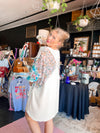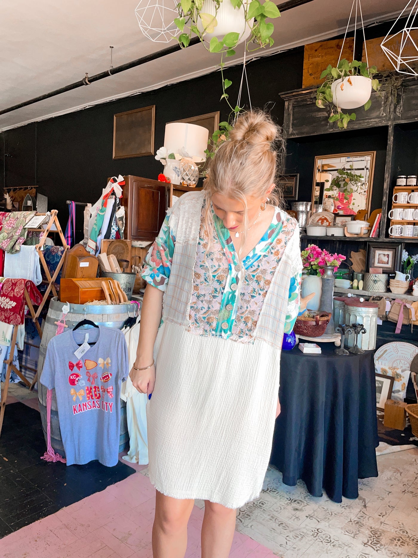 Natural mixed cotton dress with patchwork hem and top with 3/4 sleeves. This fun top is great to wear to a concert with boots or to the winery with the girls paired with sandals and jewelry.