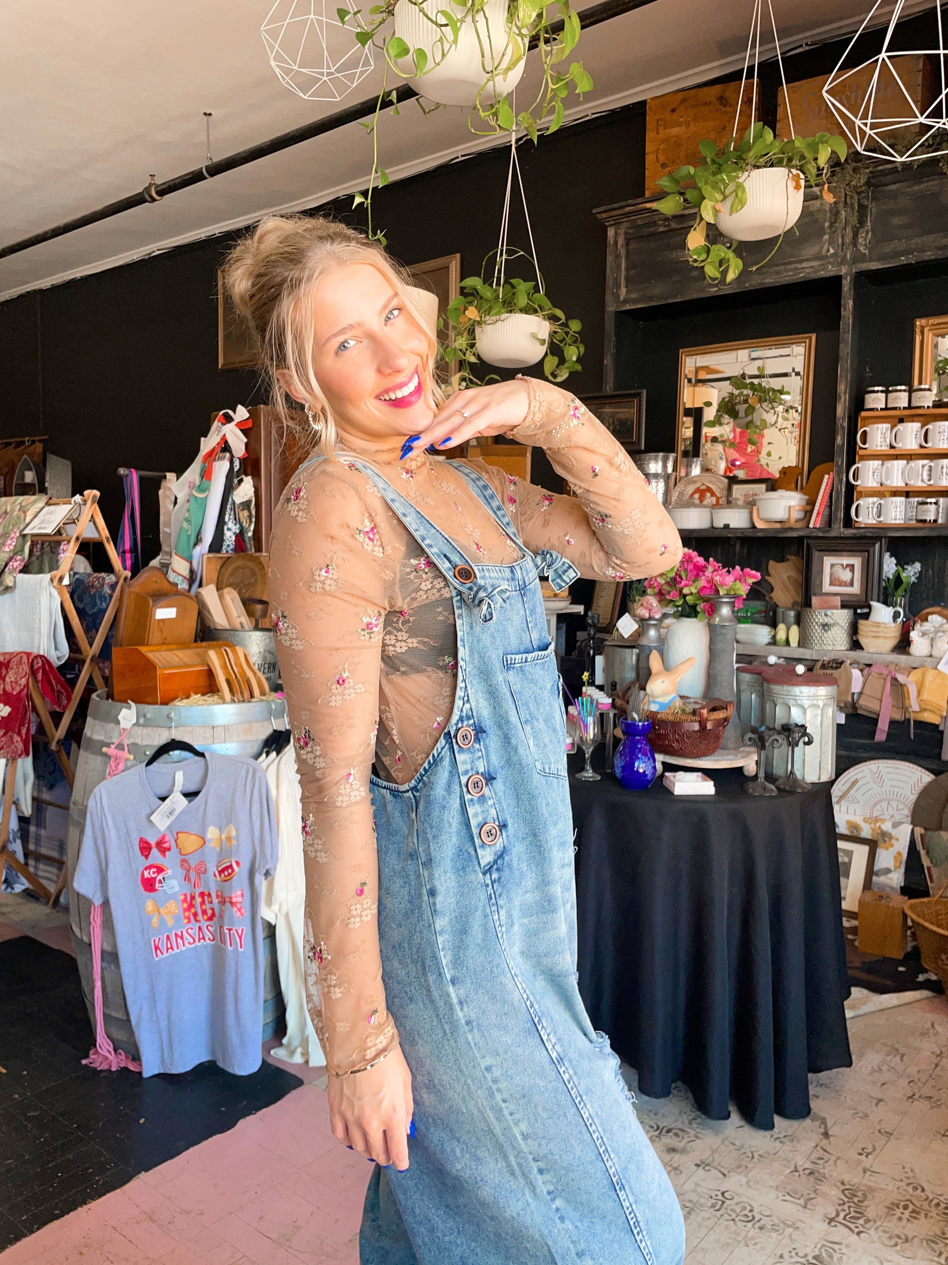 Camel long sleeve mesh shirt with floral embroidery detail. Elevate the look of any tee with this top or wear it under a vest or overalls for a trendy look.