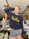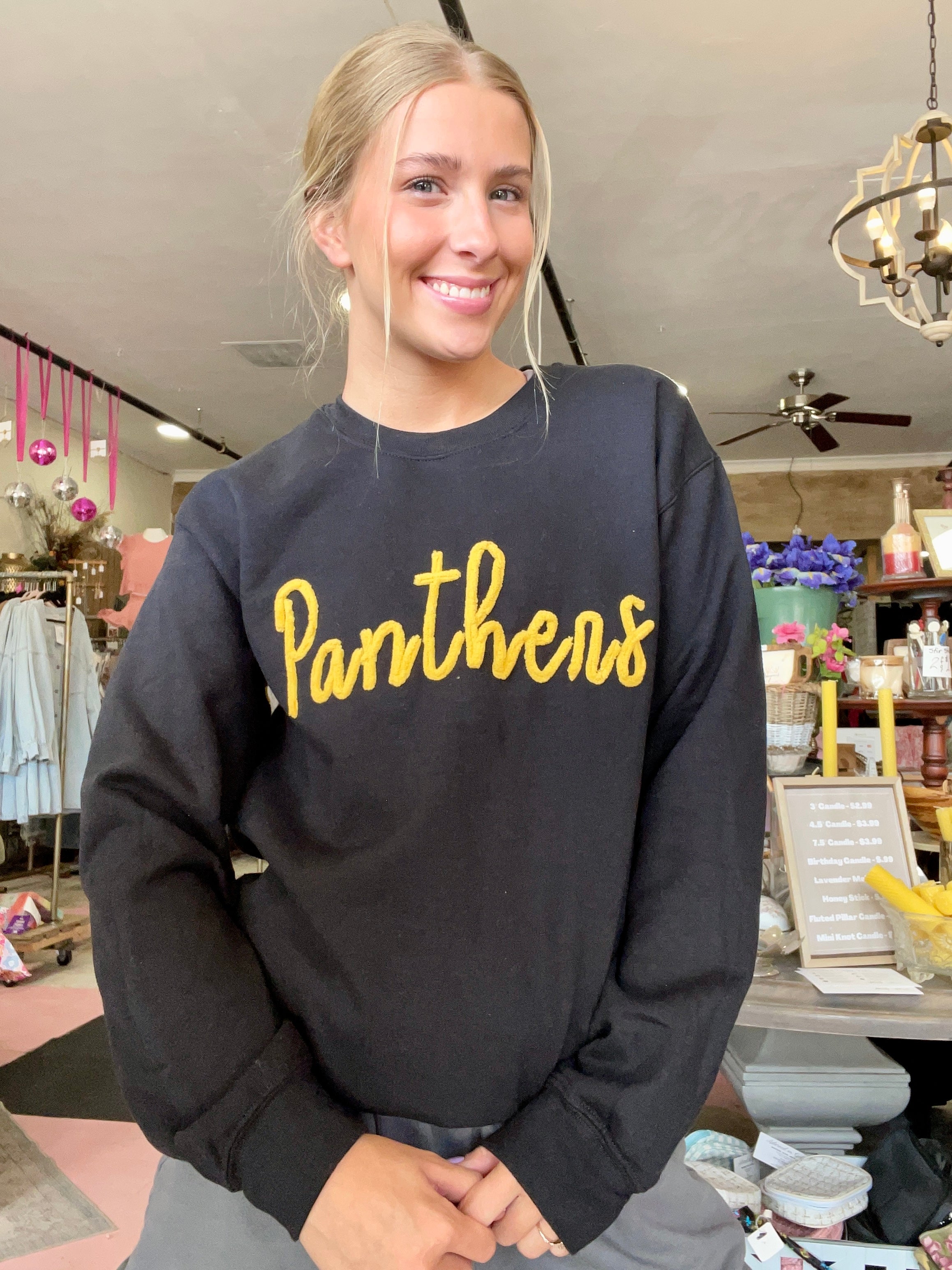 Stay game-day ready with the Panther Puff Sweatshirt, featuring bold black fabric accented by striking gold chunky yarn lettering. This expertly crafted sweatshirt combines comfort and style, making it perfect for showing team spirit while keeping warm. Its distinctive textured lettering adds a unique, premium touch to your casual wardrobe.