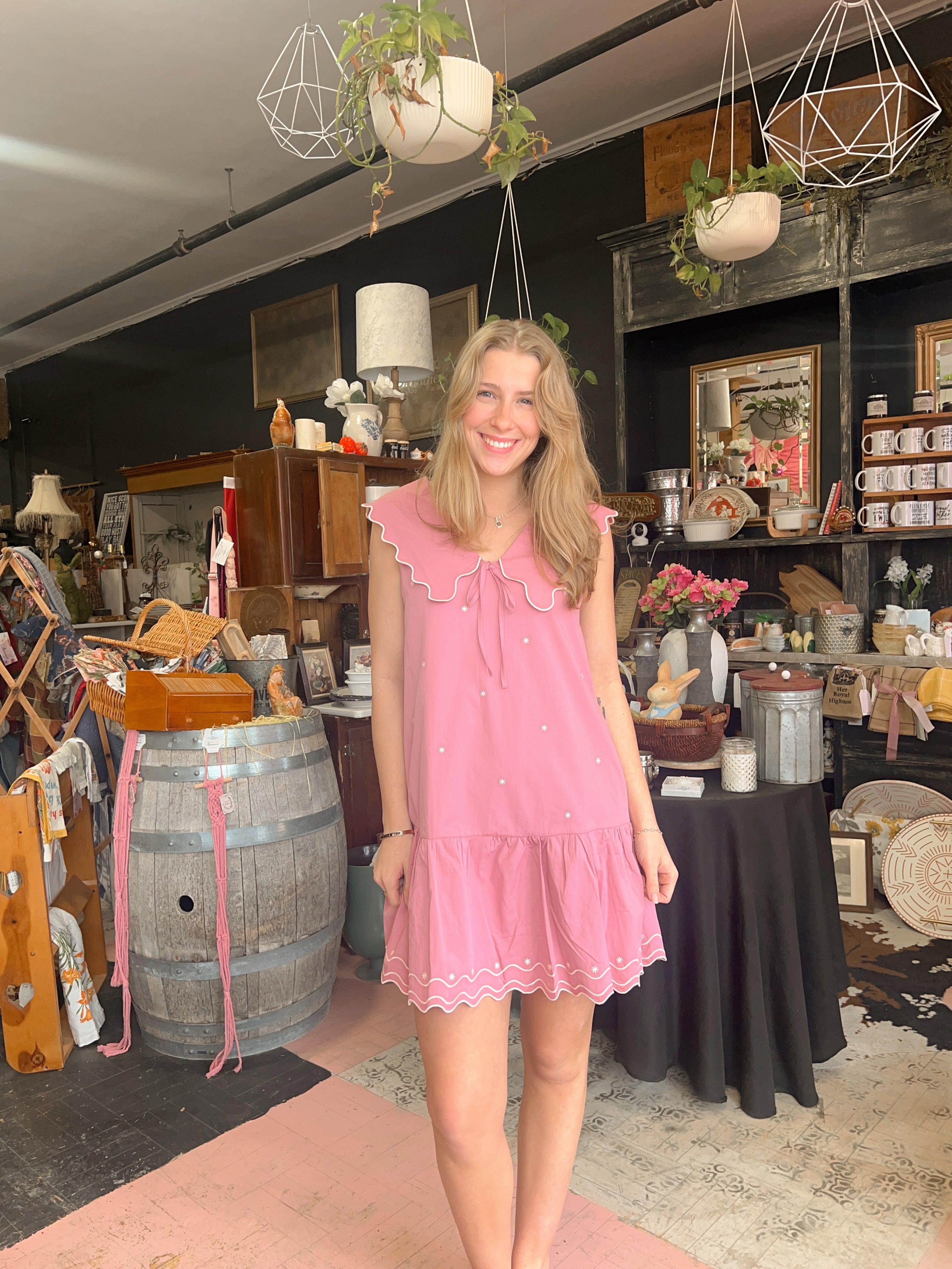Berry pink mini dress with embroidered scallop collar and dainty flowers. This dress is just the right amount of sweetness with style. Wear this to any party of celebration.