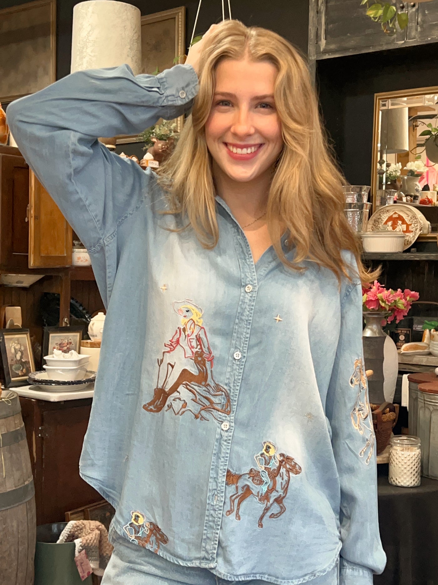 Medium wash denim button up with western motif embroidered. Add some western flare to your closet with this easy to layer piece.