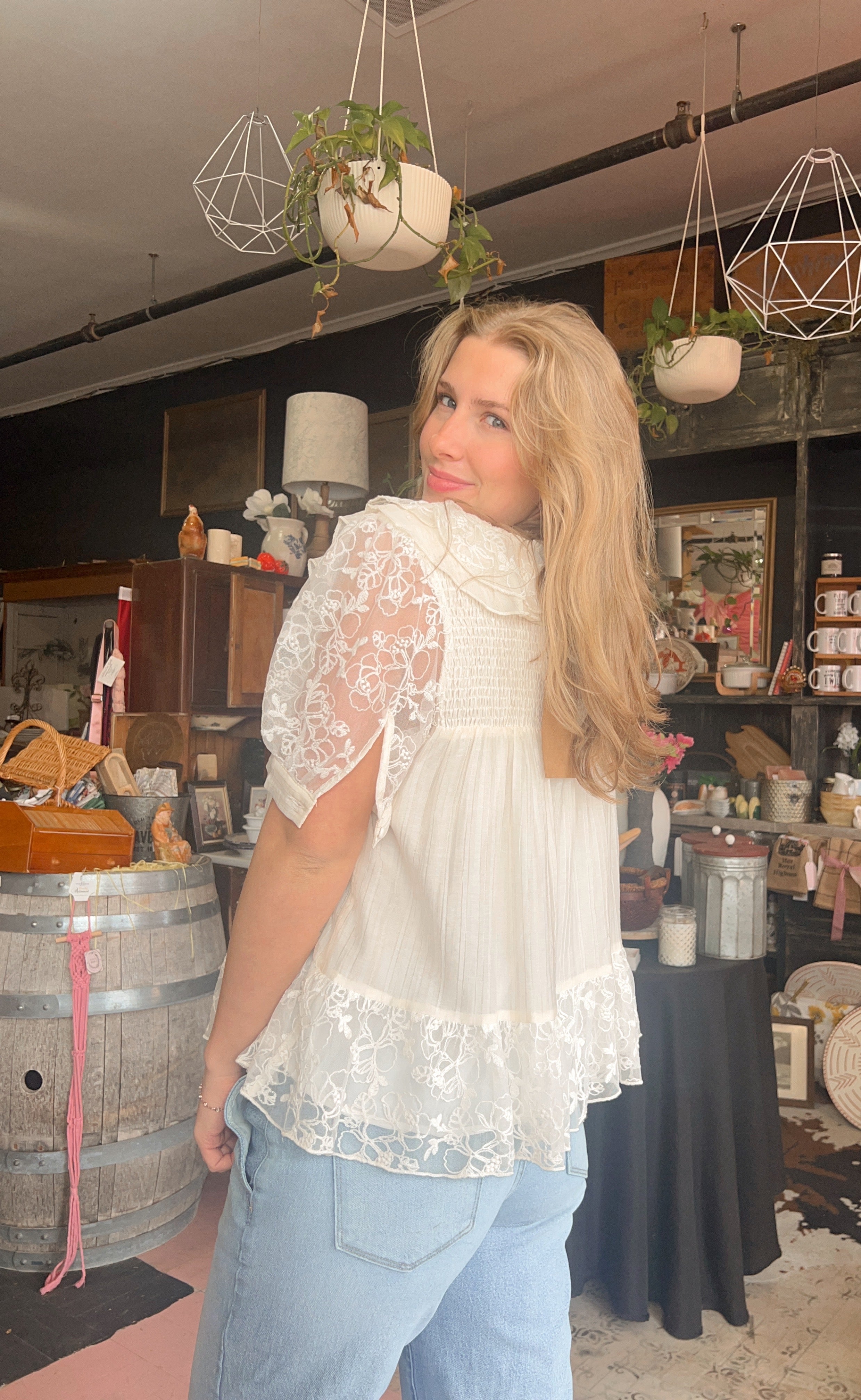 Cream lace trim ruffle replum blouse. Wear this romantic top to any event this season. Pair it with denim or floral bottoms for a effortless look.