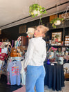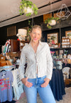 Ivory and brown striped collared shirt with long sleeves and tie shirt. Wear this shirt to the office with slacks or out to dinner with jewelry and leather pants.